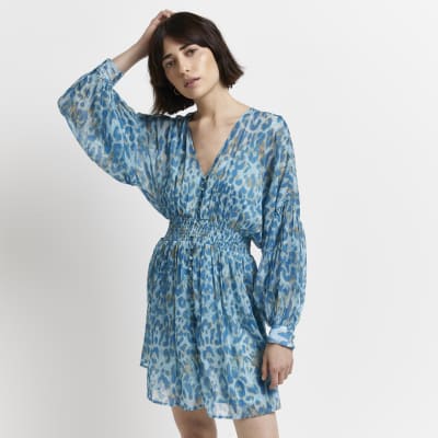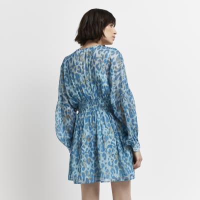 Blue Leopard Print Mini Shirt Dress River Island